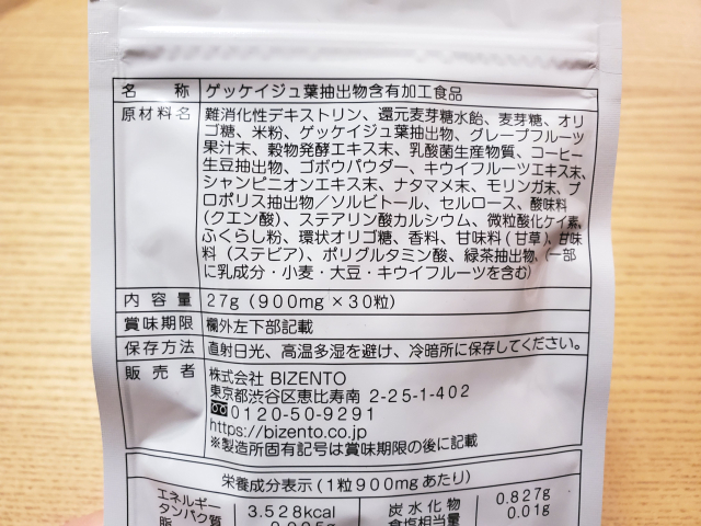 | 原材料 | 難消化性デキストリン、還元麦芽糖水飴、麦芽糖、オリゴ糖、米粉、ゲッケイジュ葉抽出物、グレープフルーツ果汁末、穀物発酵エキス末、乳酸菌生産物質、コーヒー生豆抽出物、ゴボウパウダー、キウイフルーツエキス末、シャンピニオンエキス末、ナタマメ末、モリンガ末、プロポリス抽出物/ソルビトール、セルロース、酸味料(クエン酸)、ステアリン酸カルシウム、微粒酸化ケイ素、ふくらし粉、環状オリゴ糖、香料、甘味料(甘草)、甘味料(ステビア)、ポリグルタミン酸、緑茶抽出物、(一部に乳成分・小麦・大豆・キウイフルーツを含む) |