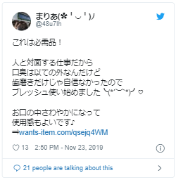 職場の女の子がいつも持ってるサプリが気になって聞いたら、口臭をキレイにするサプリだって。1粒もらったら、スーッと臭いが消えて、仕事中ずっとそのまま!これには驚きで、すぐ自分でも買いましたね。