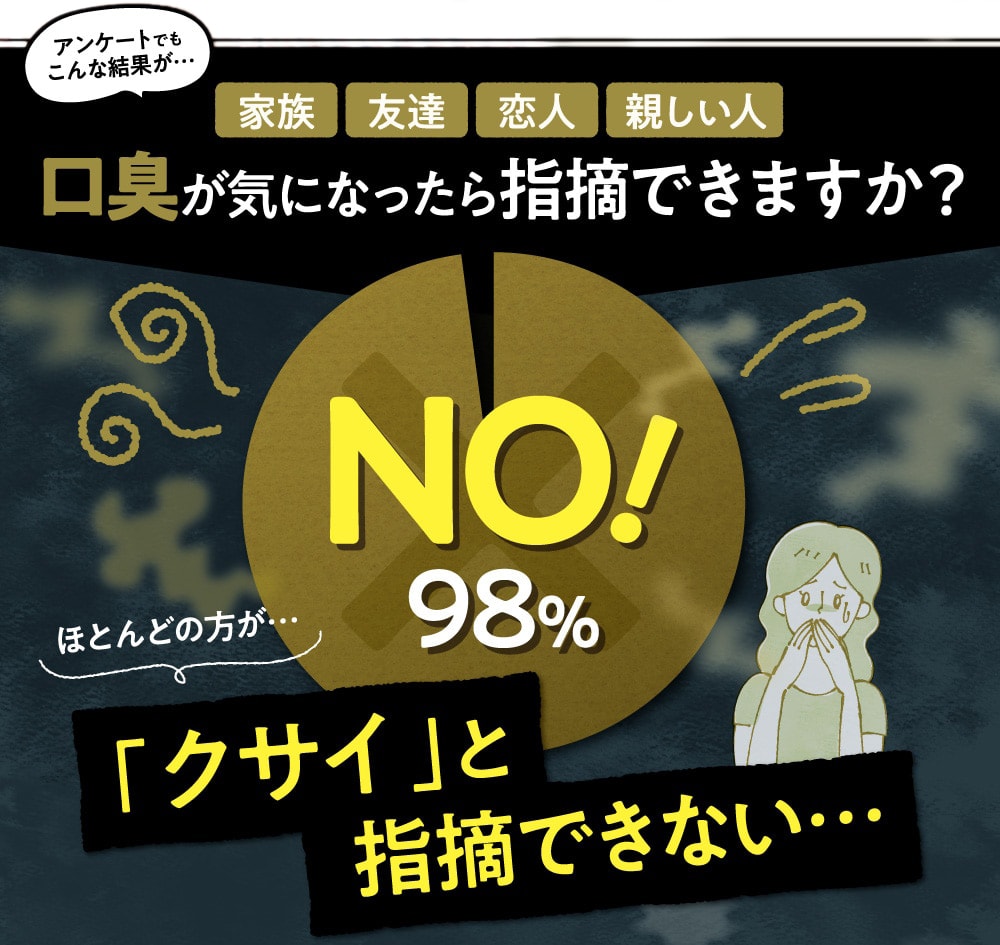 実は『家族や友人、恋人などの口臭が気になったとき指摘できますか?』というアンケートで、98%もの人が『いいえ』と答えています。